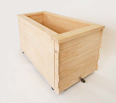 「誰でも簡単に、どこでも入浴できる浴槽」を基本に開発した、移動式の檜風呂。浴槽の側面にドアを設け、高齢者や障がい者にとって危険で困難な「またぎ動作」をすることなく浴槽に出入りできるようにしました。また、専用の台車と入浴用の椅子を使用することで、入浴者が座ったまま浴槽に出入りすることも可能。浴槽本体を動かしやすい設計であることも特長で、屋外に運び出せば露天風呂としても楽しめます。檜の浴槽はやわらかい肌触りで、高いリラックス効果を期待できる心地よい香りが漂うのも魅力。介護する人もされる人も「楽しい」入浴時間を実現する浴槽です。