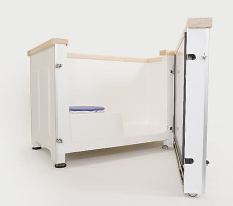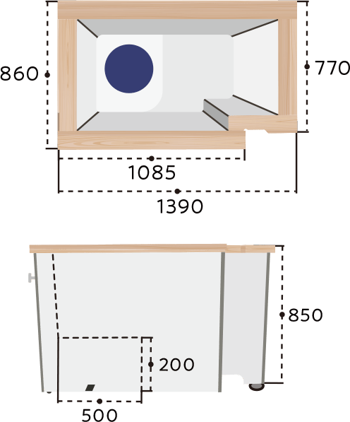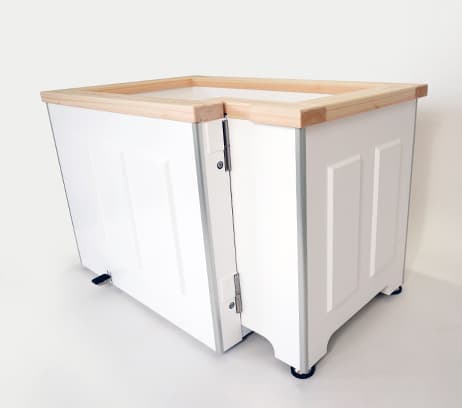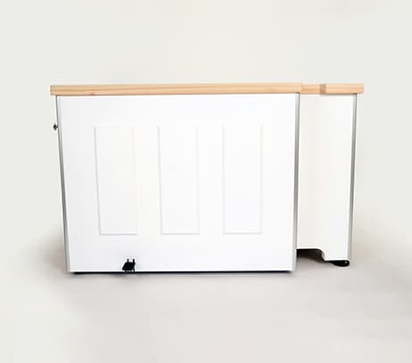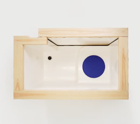 白を基調とし、浴槽の縁に檜材を使用した置き型浴槽。浴槽の側面にドアがあり、入口に回転する座面を設けました。これで高齢者や障がい者にとって危険で困難な「またぎ動作」をすることなく浴槽に出入りできるようにしました。浴槽はお手入れがしやすいFRPを使用。また、縁には檜材を用いて、やわらかい肌触りと心地よい香りを実現。高いリラックス効果も期待できます。介護する人もされる人も「楽しい」入浴時間を実現する浴槽です。